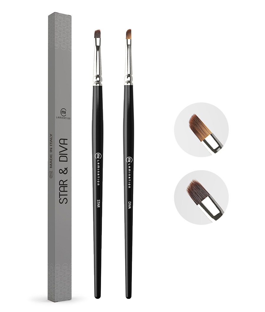 Pennelli sopracciglia professionali Star & Diva fini, compatti e sottili per applicare il prodotto con estrema precisione e uniformità.